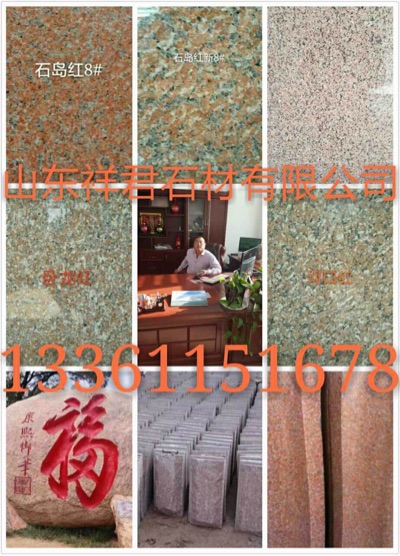 山东荣成市祥君石材有限公司厂价直销!石岛红!!樱花红!!荣成灰!!皇室冰花!!皇室玛瑙 !! 紫晶钻!!皇室珍珠!!皇室玫瑰!!皇室啡!!皇室棕钻!!中磊红!!龙须红!!白麻!!黄金麻!!中国棕!!文登灰!等山东石材及异型加工。全自动磨光,大型喷砂机.红外线切割。另有大量库存地铺小规格低价出售。请小窗口联系。 联系电话:13361151678 {手机号即微信号} QQ号570477878 网址:www.rcxiangjun.com或www.rcxjsc.com 欢迎来公司考察指导。 地址:山东威海荣成市人和 镇石材产业园